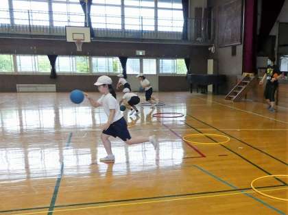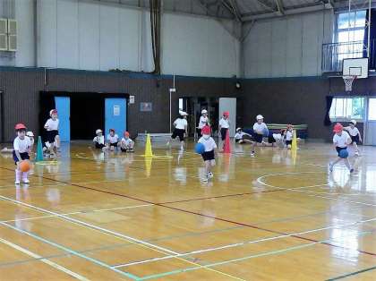 7月始めの雨の日の体育の様子です。ボールをドリブルしたり、運んだりしながらリレーをしました。このような「多様な様な動きをつくる運動遊び」の授業では、夢中になって運動することを楽しむうちに、動きが身に付いていきます。低学年では特に、「動きのレパートリーを増やす」ことを大切にしています。