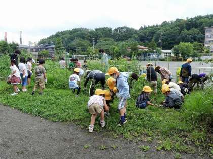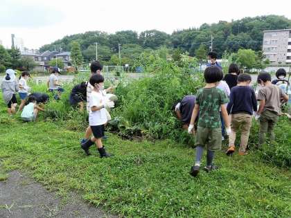 サツマイモ畑の草取りをした日です。2年生が草取りに出ると、1年生もミニトマトの収穫と草取りを始めました。雨上がりでしたので、雑草も抜きやすかったようです。最後は、3年生もがんばっていました。野菜の周りがすっきりしました。
