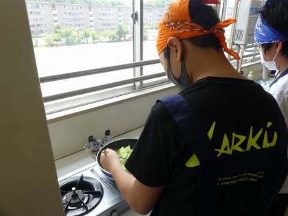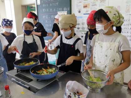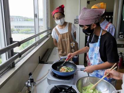 交代して全員が炒めるを体験しました。味付けは、塩・コショウです。味見は先生なので、ビンを振る回数が決まっています。ゆっくり塩を振りかけると、味が濃くなってしまいます。お家で作るときは、途中で味見をしてくださいね。