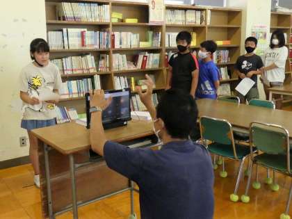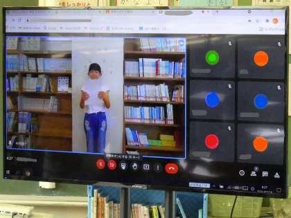 教室のテレビには、こんな感じで映っています。見えない相手に話しかけるのは、難しいですね。