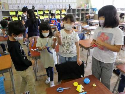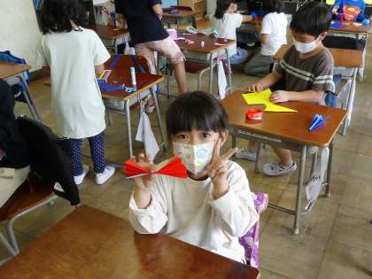 折るだけでなく、切ったり、のりで接着したりしました。「先生 できたよ」と見せてくれました。