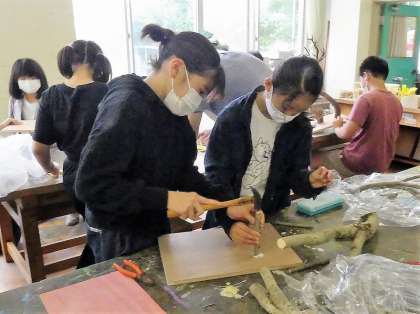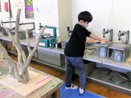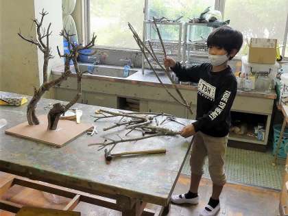 木の材料を組み合わせて、自然の中にある「ひみつのすみか」をつくります。木を土台につけるところは、友達と協力して行いました。