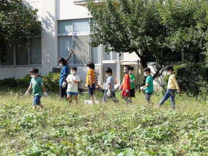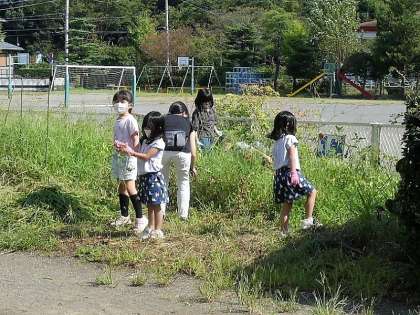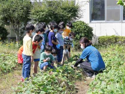 1年生は、サツマイモと雑草の違いを教えてもらってから、草取りをしました。