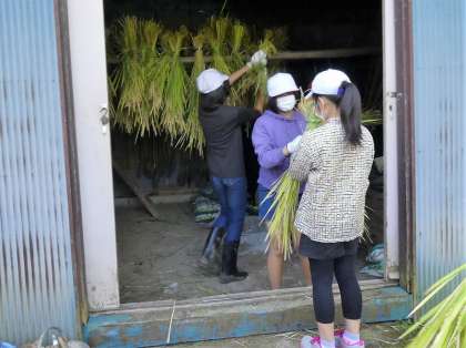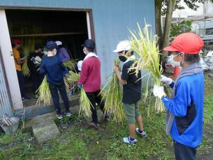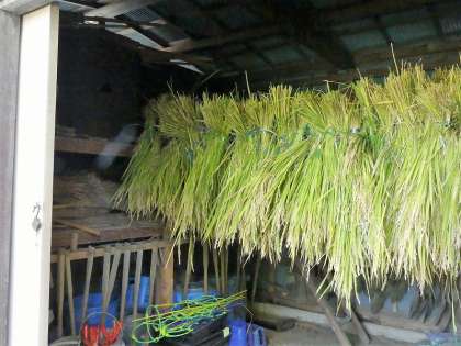 刈り取った稲は、リヤカーにいっぱいになりました。裏の農具倉庫に運び掛け干しをしました。