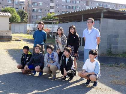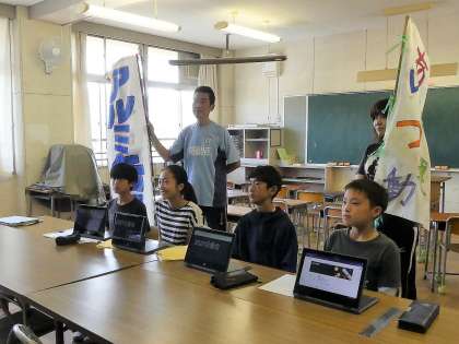 飼育委員会と児童会委員会の写真です。わかばちゃんも写っています。