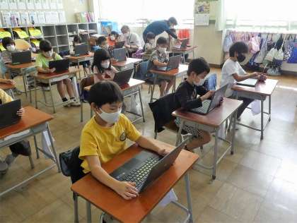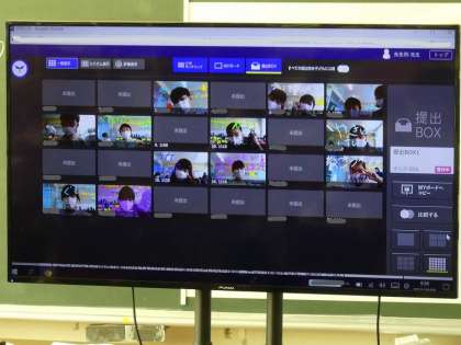 国語の「たのしかったことをかこう」の学習です。自分の写真を撮って、その画像に手書きで、頑張っていることやすきなことを書き、提出ボックスに送信しました。先生の指示を聞きながら、次々に作業をすすめていました。友達の画像が大きく映し出されると、うれしそうにしていました。