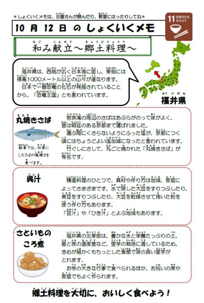 今月から月に一度、給食で全国各地の郷土料理を食べる取り組みをします。今月は「福井県」の郷土料理です。