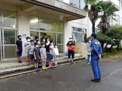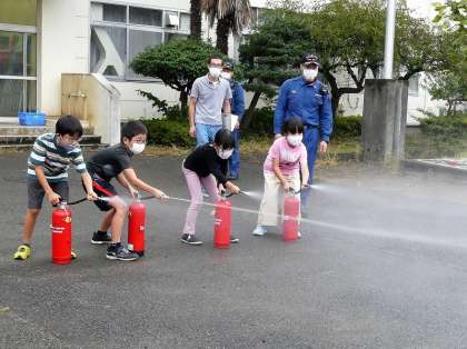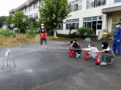 今回は水が出る訓練用の消火器でしたが、操作をすると水が出るので、子供たちは真剣に消火器訓練ができました。