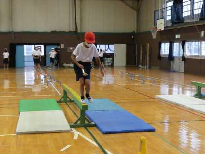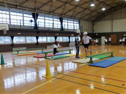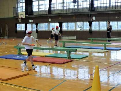 この日は、「障害物リレー」です。1回目ただのリレー、2回目障害物リレー、3回目ピンポンリレー(卓球のラケットにボールをのせて)、4回目はお玉リレーと、バリエーションが豊富です。1位をとったグループは、スタート位置を遠くするなど、最後まで接戦となり、盛り上がりました。