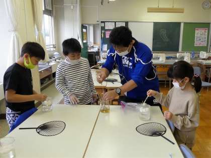 3年生は、育てていた「カイコガの幼虫(カイコ)」の繭から糸取りをしました。桑の葉だけを食べて大きく育ったカイコがきれいな形の白の繭を作ったところから、糸をどのようにとるのか、先生の説明を聞いて作業に取り組みました。