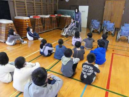 4年生が車いす体験をしました。2人一組で、乗る人、押す人の両方を体験しました。