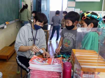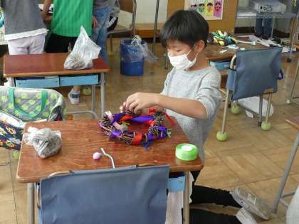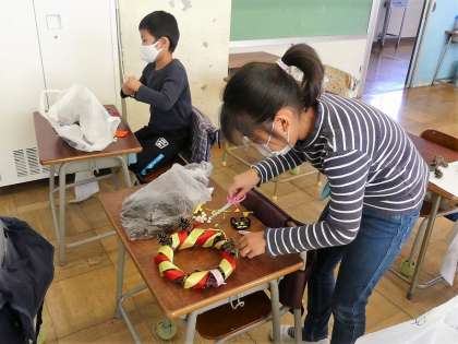 サツマイモつるのリースづくりです。リボンを巻いたり、松ぼっくりをつけたり、楽しみながら作っています。