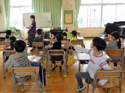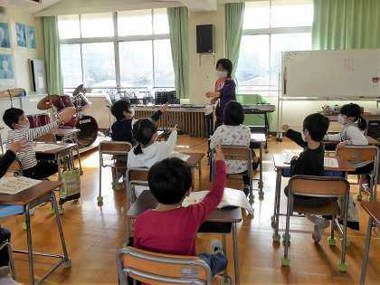 友達と一緒に歌ったり、音楽に合わせて体を動かしたりして、日本に伝わるわらべうたの楽しさを感じ取る学習です。今日は友達とのペアではなく、先生対子供たちで、「おちゃらか ほい」を楽しみました。