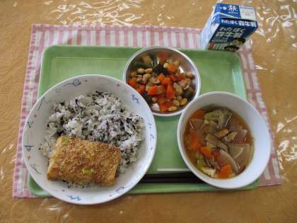 11月8日は「いい歯の日」です。今日の給食は、ごはんにわかめやじゃこを混ぜ合わせて噛みごたえのある献立にしています。