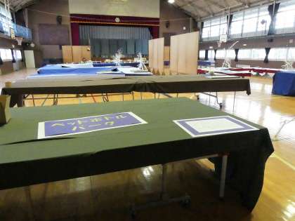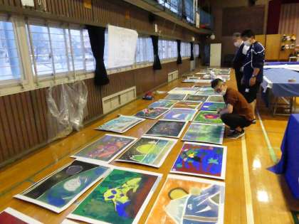 作品展の準備がすすんでいます。平面の作品は、いくつかの作品をつなげて、体育館の壁に掲示します。