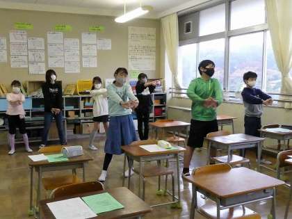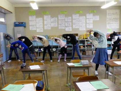 保健体育委員会では、もうすぐ始まる全校持久走の準備をしていました。準備体操(たけのこ体操)を担当します。