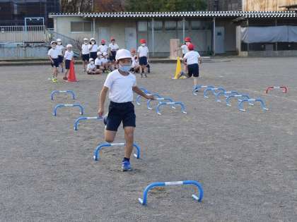 折り返しリレー遊びを行いました。ミニハードルを飛び越えながら、2グループで競争しました。勝っても、負けても、一生懸命走っていました。
