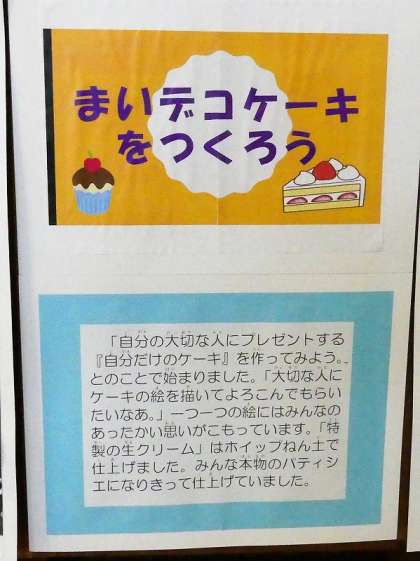 「まいデコケーキをつくろう」は、ホイップねん土で仕上げました。「これは、食べられますか」と聞いた子供もいたようです。