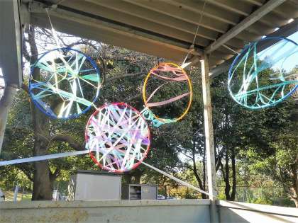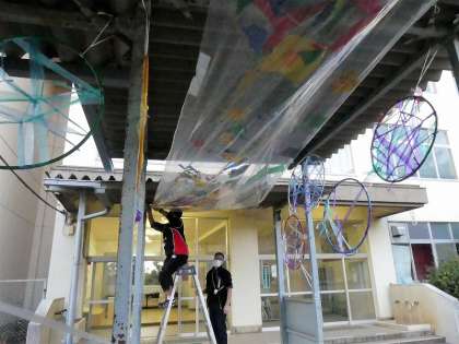 体育館までの通路には、2年・3年の造形遊びでつくった作品が飾られています。