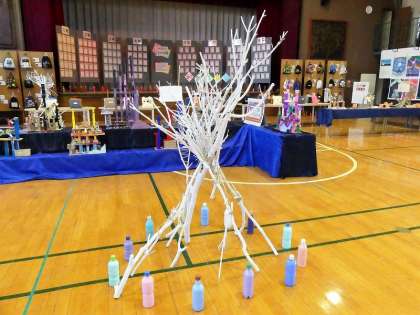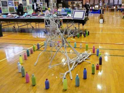 4年生が木の枝をつないだ作品と、1年生の色水は、体育館に飾られています。