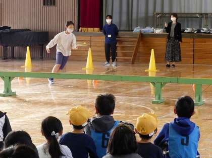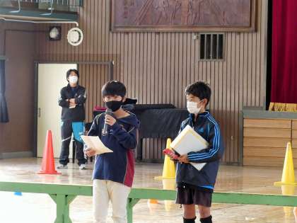 今朝の集会は、なかよし班でピンポン玉リレーを行いました。まずは、児童会委員会の子供たちが、ルール説明や見本を見せてくれました。