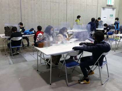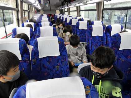 集合時刻ちかくになると、子供たちが戻ってきました。昼食は、雨のため、バスの中でした。補助席も使い、密を避けて黙食です。