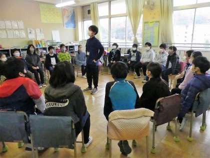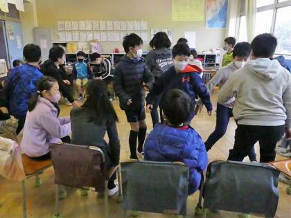 5年生も「フルーツバスケット」です。「校外学習に行ったことのある人」で、インターンシップの学生さんが、鬼(?)になっていました。
