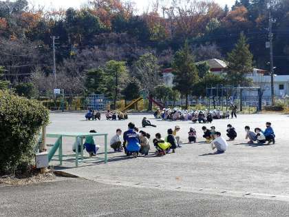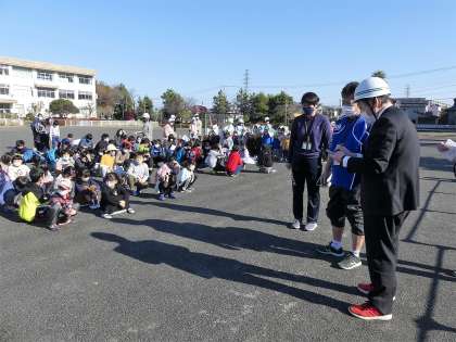 12月の避難訓練の想定は、休み時間に地震が発生した場合でした。校舎内にいる児童は、机の下にもぐり、校庭にいる児童は、その場でしゃがみます。