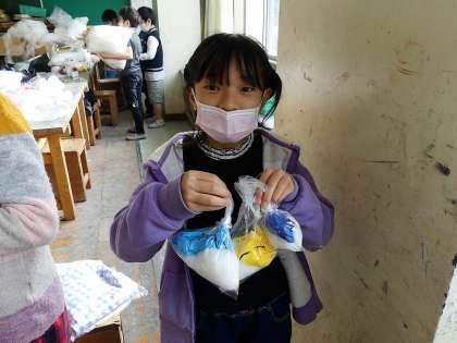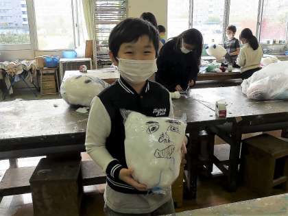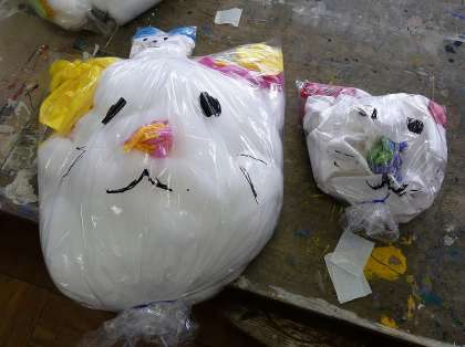 目や口を描いたり、つけたりしたら完成です。いろいろな大きさのお友達を抱きかかえて、感触も楽しんでいました。