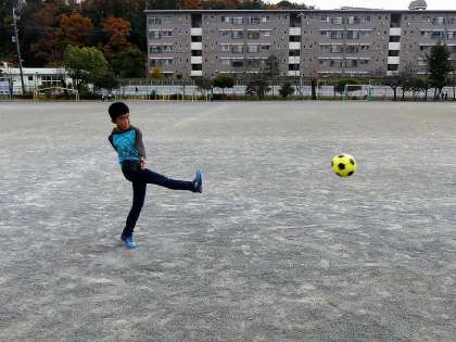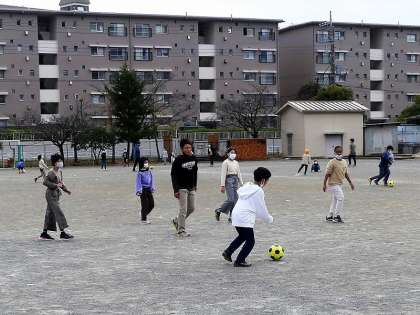 4年生が校庭でサッカーをしていました。男女一緒に盛り上がっていました。