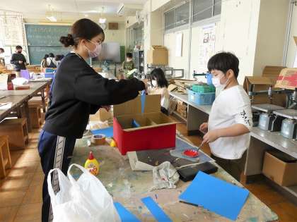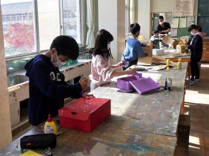 段ボールの形や特徴を生かして、身近な生活で使える入れ物を考えました。1・2年使えるものを目標に、自分だけの宝箱をつくっていました。