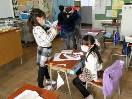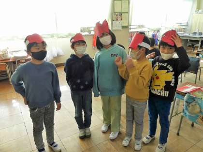 スイミーに登場する、「小さな赤いさかな」や「いそぎんちゃく」「くらげ」「うなぎ」などのお面をつくっていました。役割を決めて、音読をするのかな。