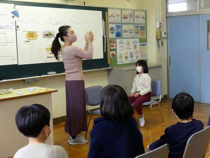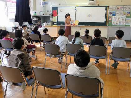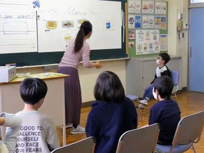 英語の絵本の読み聞かせのあと、レストランで注文するやり取りのアクティビティにチャレンジしました。メニューは、「カレーライス」「ステーキ」「ピザ」「ハンバーガー」などです。みんな意欲的に取り組んでいました。