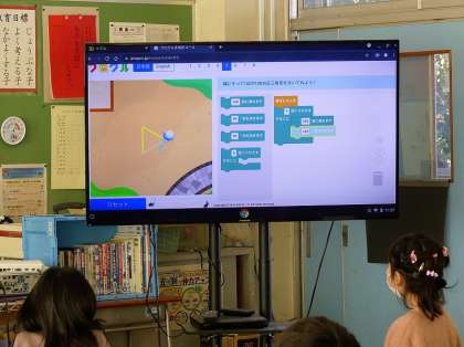 プログラミングの基本的な概念である「順次処理」「繰り返し」を使って、図形を書きました。プログラムを入力すると、その通りにキャラクターが動いて行きます。何度も同じ命令を繰り返さずに簡単にできないか、みんなで考えました。