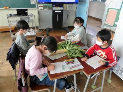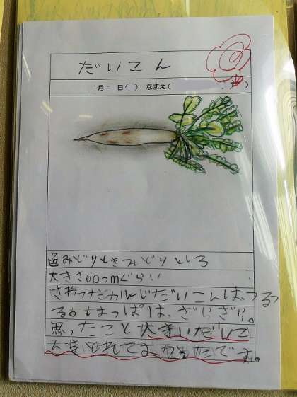 大根を収穫した後、色や形、手触りなどをよく観察して、カードにまとめました。