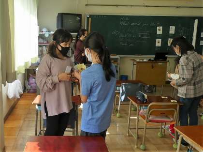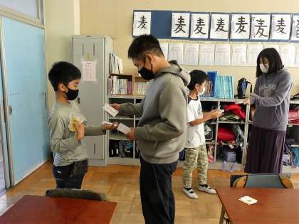 買い物ゲームをしています。何がほしいか伝えて(もちろん英語)、お金を払います(ドルです)。英語のやり取りが上手な4年生です。