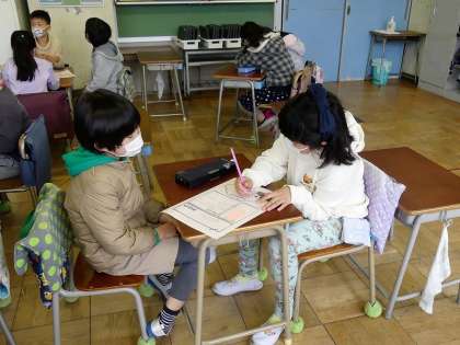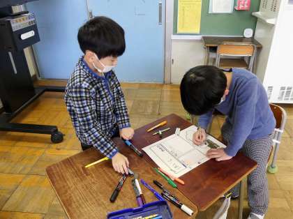 2年生は、係決めをしたあと、仕事内容やメンバーなどを画用紙にまとめました。友達へのお願いごとも、相談していました。新しい係(当番)になって、張り切っています。