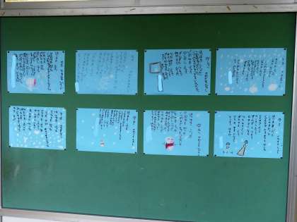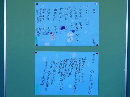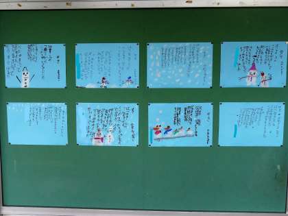 国語で「ゆき」という詩を学習しました。「初雪」「粉雪」「べた雪」など、いろいろな雪について、知ることができました。最後に、詩を視写し、自分のイメージの絵も描きました。雪だるまが、とてもかわいいです。