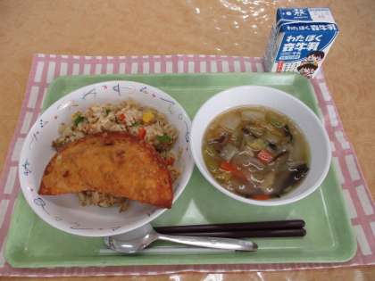 今日の給食は、揚げぎょうざでした。豚肉や白菜、ニラ、はるさめなどを混ぜ合わせた餡を大きなぎょうざの皮で包み、油で揚げました。にんにくがとても効いていて、教室が中がにんにくの香りに包まれていました。
