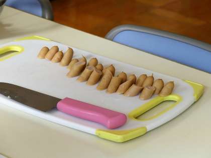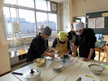 野菜やいもには、水からゆでる物と沸騰した湯からゆでる物があります。今回は、いもをゆでて、ジャーマンポテトを作りました。ジャガイモの皮をむいて、芽をとります。ピーラーを使っている子どもが多いようです。