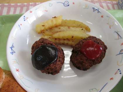 肉団子にはケチャップベースの赤いソースと、黒ごまベースのソースがかかっており、ポテトには刻んだ桜の塩漬けがまぶしてあります。