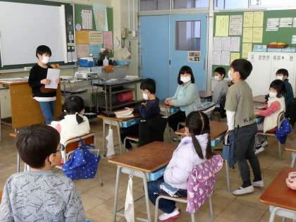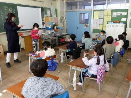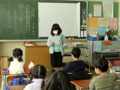 好きな食べ物の様子を言葉で表す学習をしました。どんな色か、どんな形か、味や食べた時の感じも言葉で表現しました。書きあがった内容をクイズにして、友達に答えてもらいました。「上の色は茶色で、下は黄色です」「味は、甘くて、少しにがいところもあります」などなど。詳しく言葉で伝えることができました。