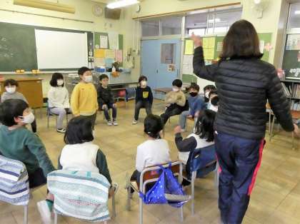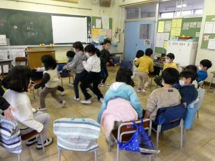 雪が積もれば外遊びの予定でしたが、今日は、教室でゲームやダンスをしました。写真は、フルーツバスケットを楽しんでいるところです。