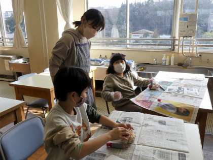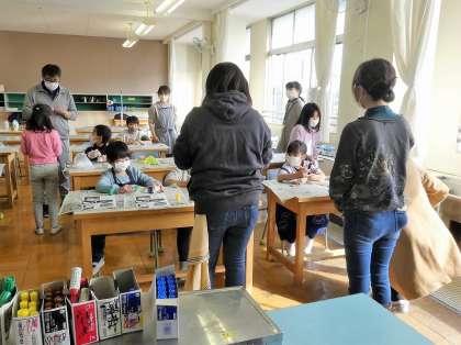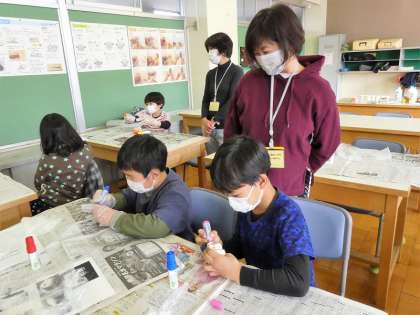 2年生は、油性マジック染めです。お家の人に手伝ってもらいながら、手提げにきれいな模様を染め上げました。