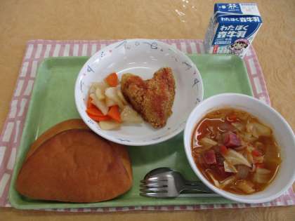 今日は「図書と給食のコラボの日」でした。図書と給食のコラボの日は、絵本に出てくる料理や食材を使ったメニューが給食に登場します。