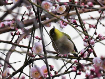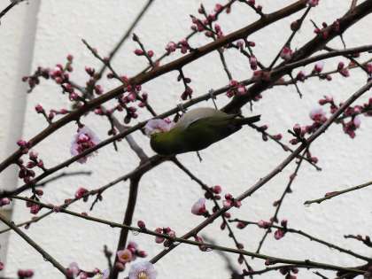 雨がやんだら、さっそくメジロが梅の花の蜜を吸いに飛んできました。今年もベストショットを狙いたいのですが、まだ、ピントが今一つです。