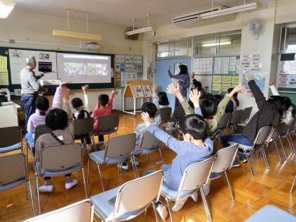 ニュージーランドの校庭の様子も、案内してくれました。芝生の校庭が、気持ちよさそうでした。交流の最後には、じゃんけん大会をしました。