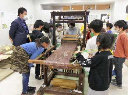 明治時代に実際使われていた高機(たかばた)で機織り(はたおり)を見せてもらいました。