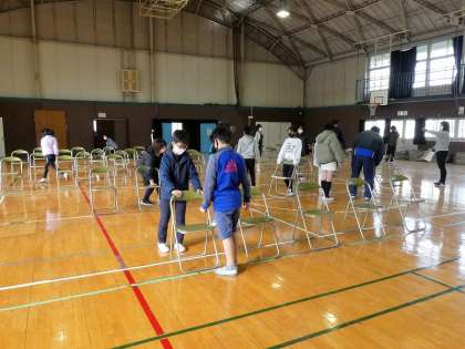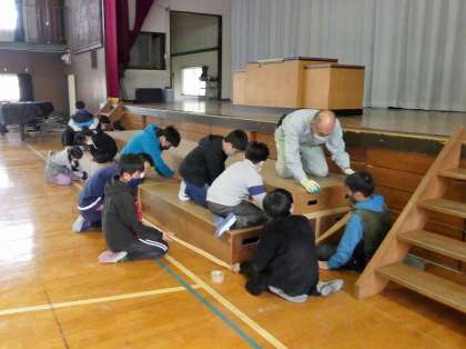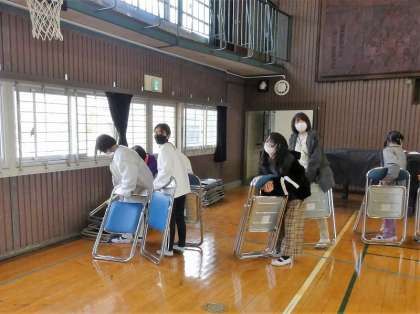 卒業式の準備や練習が始まりました。5年生は、会場準備の担当です。椅子を並べたり、ひな壇を固定したり、よく働いていました。