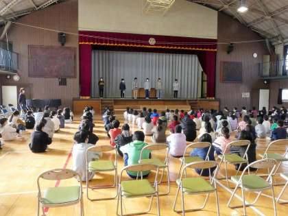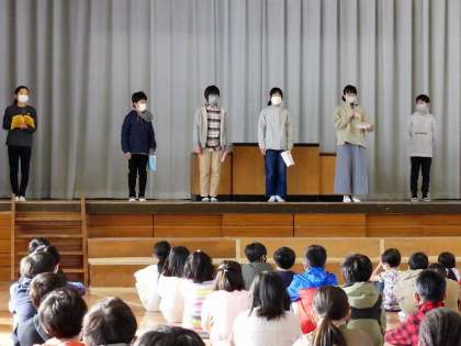 今日の集会は、委員長発表集会でした。鹿島小学校には、図書委員会・放送委員会・保健体育委員会・飼育委員会の4つの委員会があります。6年生の委員長が、この1年間の頑張りや活動報告をしました。それぞれの委員会で活躍した様子が下級生によく伝わってきました。5・6年生のみなさん、1年間お疲れさまでした。